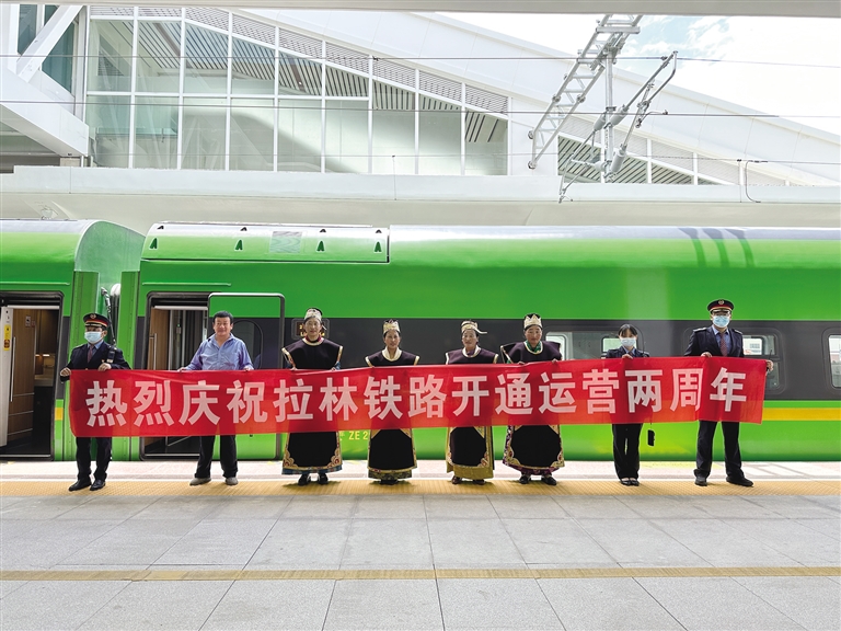 2021年6月25日,拉林鐵路開通運營,結束了藏東(dong) 南不通鐵路的曆史,複興(xing) 號動車開到西藏,駛上拉林鐵路,拉薩至山南、林芝最快1小時4分、3小時30分可達;山南至林芝最快2小時22分可達,相比汽車,從(cong) 拉薩到林芝的時間幾乎節省了一半,從(cong) 山南到林芝,也節省了2個(ge) 多小時。兩(liang) 年來,隨著運行方式逐漸成熟,鐵路方便、快捷的運輸優(you) 勢逐步顯現,客流持續攀升,青藏集團有限公司及時根據客流情況在周末、節假日、寒暑假等客流高峰期增開281趟臨(lin) 時旅客列車。兩(liang) 年來,拉林鐵路共運送旅客182.5萬(wan) 人次,運輸貨物41.91萬(wan) 噸,拉近了藏東(dong) 南地區9個(ge) 城市的距離,也深刻改變了當地人民的工作和生活觀念。