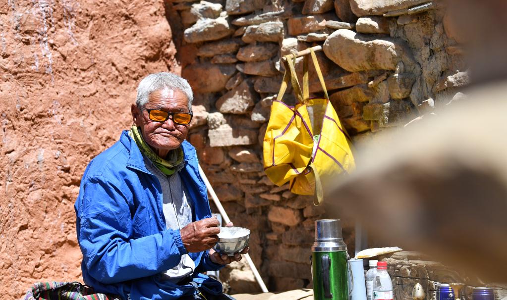 仁增旺紮老人在石窟旁的空地上吃午飯(5月26日攝)。新華社記者 晉美多吉 攝