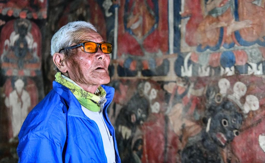 仁增旺紮老人查看壁畫(5月26日攝)。新華社記者 晉美多吉 攝