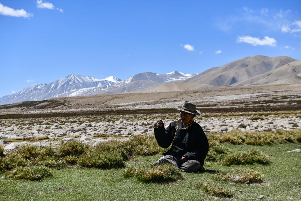 洛桑占堆在“三代房”前的草地上回憶當年的場景(5月28日攝)。新華社記者 晉美多吉 攝