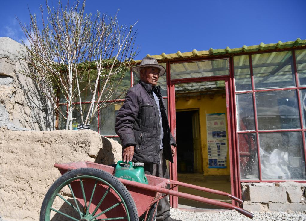 洛桑占堆從(cong) 典角村“三代房”旁的水井打水回家(5月28日攝)。新華社記者 晉美多吉 攝