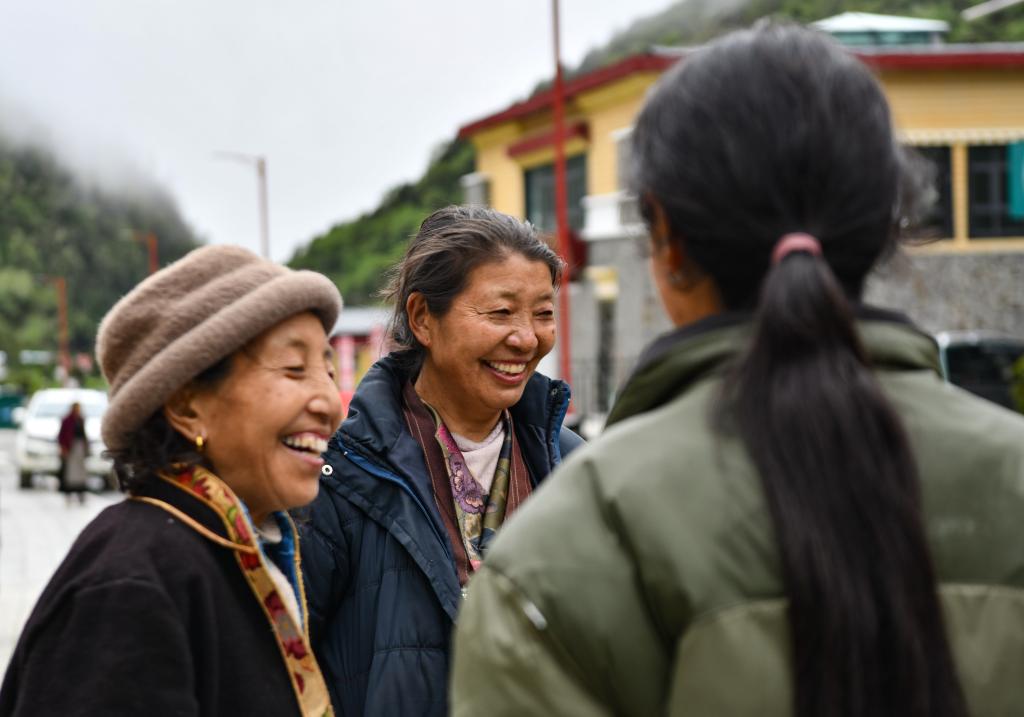 卓嘎(左一)、央宗(左二)在玉麥鄉(xiang) 街頭和街坊聊天(6月10日攝)。新華社記者 晉美多吉 攝