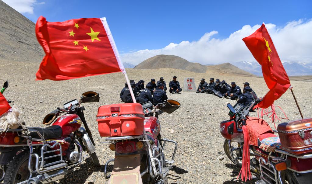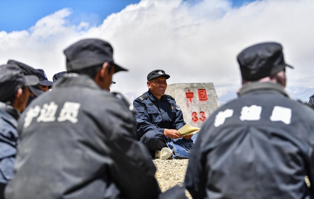 在33號界碑處,護邊隊在隊長的帶領下開展學習(xi) (6月2日攝)。新華社記者 晉美多吉 攝