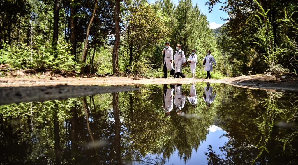 往返於(yu) 村間的王振疆(左二)與(yu) 隊員王彤旭(左一)、陳冰(右)及當地醫生尼瑪益西(右二)(6月12日攝)。新華社記者 晉美多吉 攝