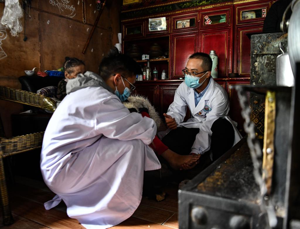 在米林的叢(cong) 林中,珠海市人民醫院的援藏醫生王振疆手捧著病人的腳,仔細詢問病人的身體(ti) 狀況,送去了援藏省市的關(guan) 心,送去了藏漢一家親(qin) 的問候。