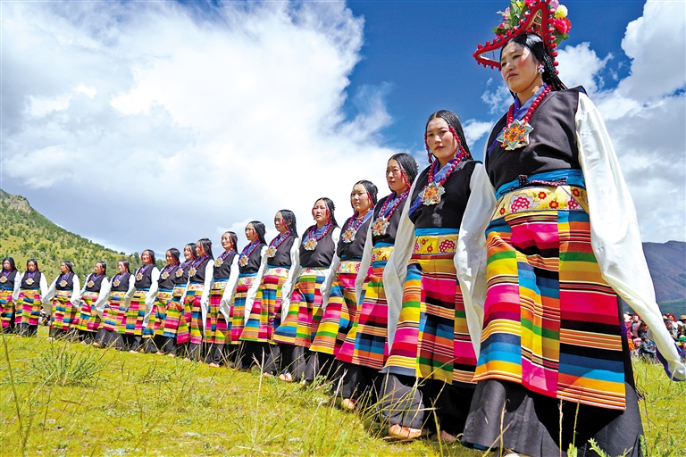 7月的林周縣唐古鄉(xiang) 綠草如茵,草地上點綴著藍色和黃色的野花。演員們(men) 以藍天白雲(yun) 為(wei) 幕,伴隨著優(you) 美的橫笛聲,跨出豪邁步伐,跳起了“熱振曲卓”。“熱振曲卓”,是林周人民智慧的結晶,在滄海桑田的變化中見證著這片土地的故事。
