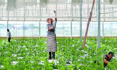 工作人員在山南市紮囊縣阿紮鄉(xiang) 的玻璃溫室裏養(yang) 護旗雲(yun) 瓜。湖南省第九批援藏工作隊引進智慧農(nong) 業(ye) 和戈壁田園植物工廠項目,在荒地建起有機果蔬基地200多畝(mu) 。攝影:辜鵬博(湖南日報攝影記者)