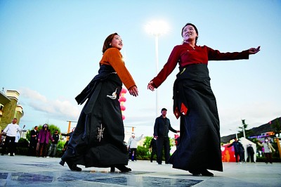 市民在湖南援建的山南市體(ti) 育館廣場上跳鍋莊舞。攝影:辜鵬博(湖南日報攝影記者)