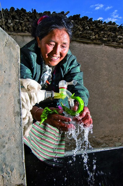 山南市隆子縣隆子鎮葉巴村村民查斯卓瑪用自來水清洗辣椒。攝影:辜鵬博(湖南日報攝影記者)