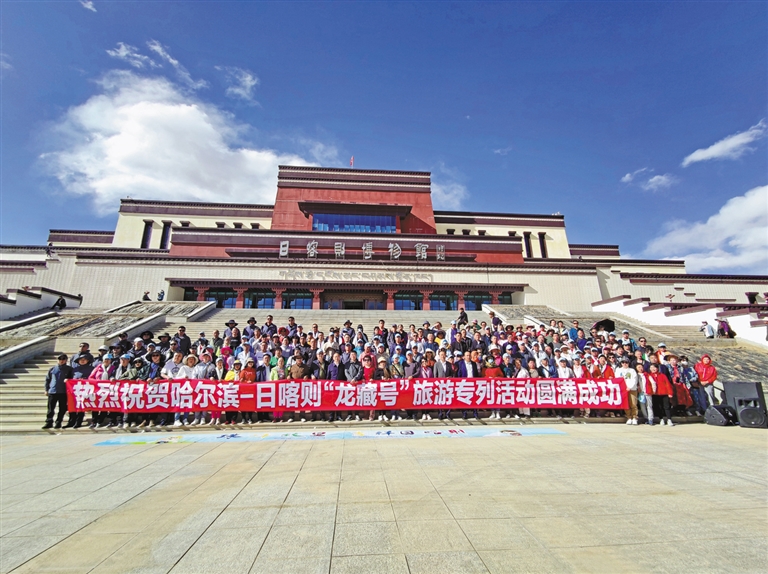 圖為(wei) 從(cong) 黑龍江省哈爾濱市乘坐2023年首趟“龍藏號”旅遊專(zhuan) 列的數百名遊客順利抵達日喀則,並在日喀則博物館合影留念(6月2日攝)。記者 汪純 攝
