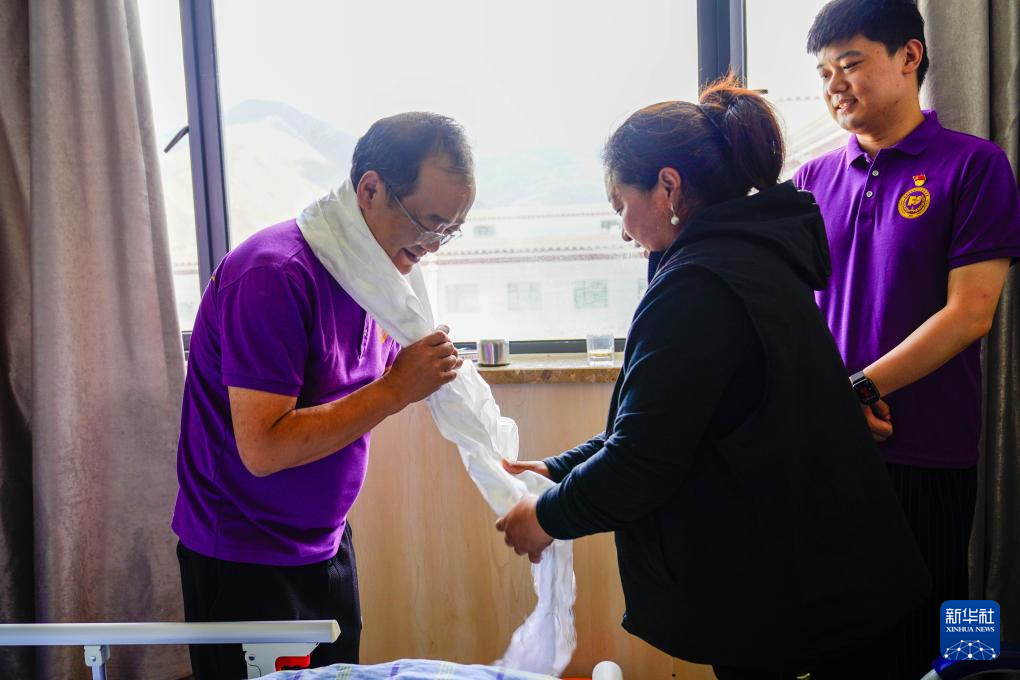 患者母親(qin) 尼珍向醫護人員敬獻哈達以表感謝。 新華社記者 劉洪明 攝