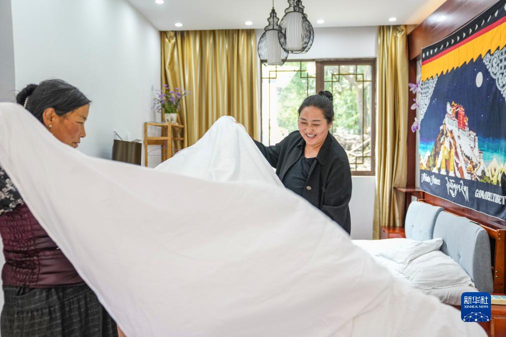在結巴村的瑪尼石民宿,村民次仁德吉(右)和姐姐一起整理房間(7月20日攝)。新華社記者 孫非 攝
