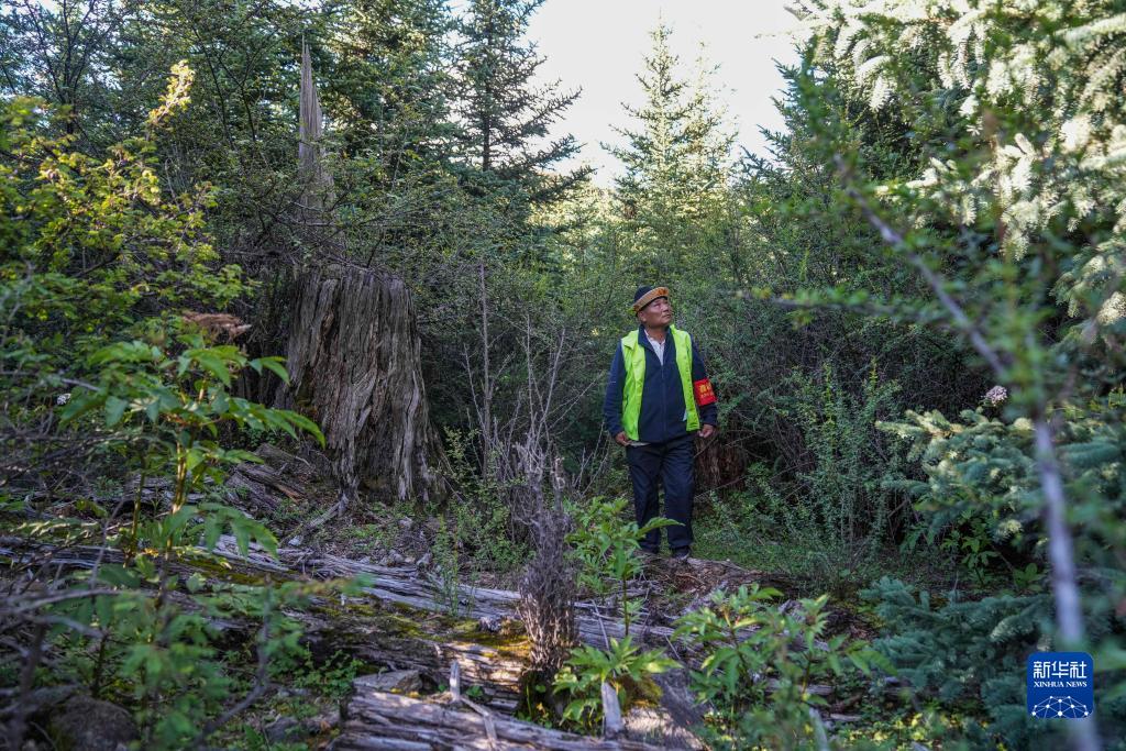 結巴村村民索朗班旦在林間巡邏(7月20日攝)。新華社記者 孫非 攝