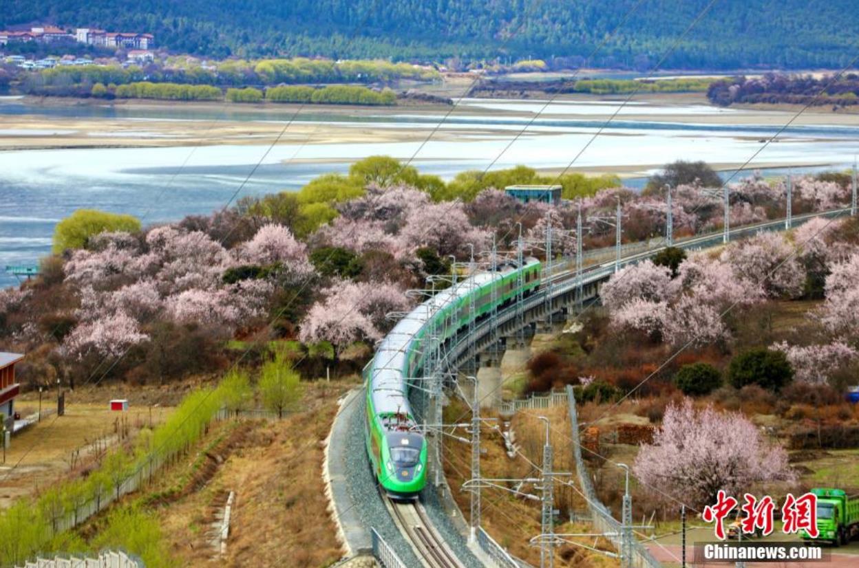資料圖:穿梭在桃花林中的拉林鐵路高原複興(xing) 號。馬生明 攝