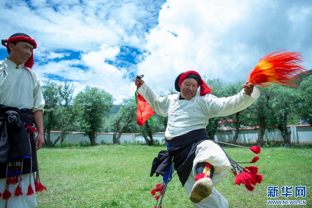 7月12日,西藏昌都市丁青縣祖化熱巴傳(chuan) 承人阿尼指導隊員跳熱巴舞。 新華網 旦增努布 攝