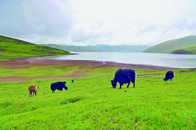 莽錯湖位於(yu) 芒康縣中部莽嶺鄉(xiang) 境內(nei) ,湖麵海拔4300多米,水域麵積20多平方公裏。圖為(wei) 莽錯湖畔的犛牛群。光明日報記者 畢玉才攝