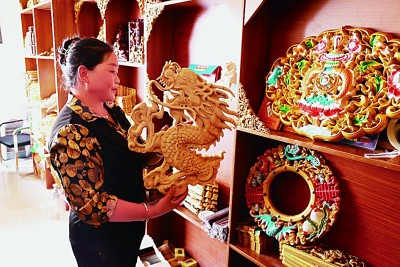 藏式木雕作為(wei) 一種民間藝術形式,在西藏各地廣泛流行。圖為(wei) 芒康縣一家工藝品店內(nei) ,店主在擺放藏式木雕手工藝品。光明日報記者 劉宇航攝