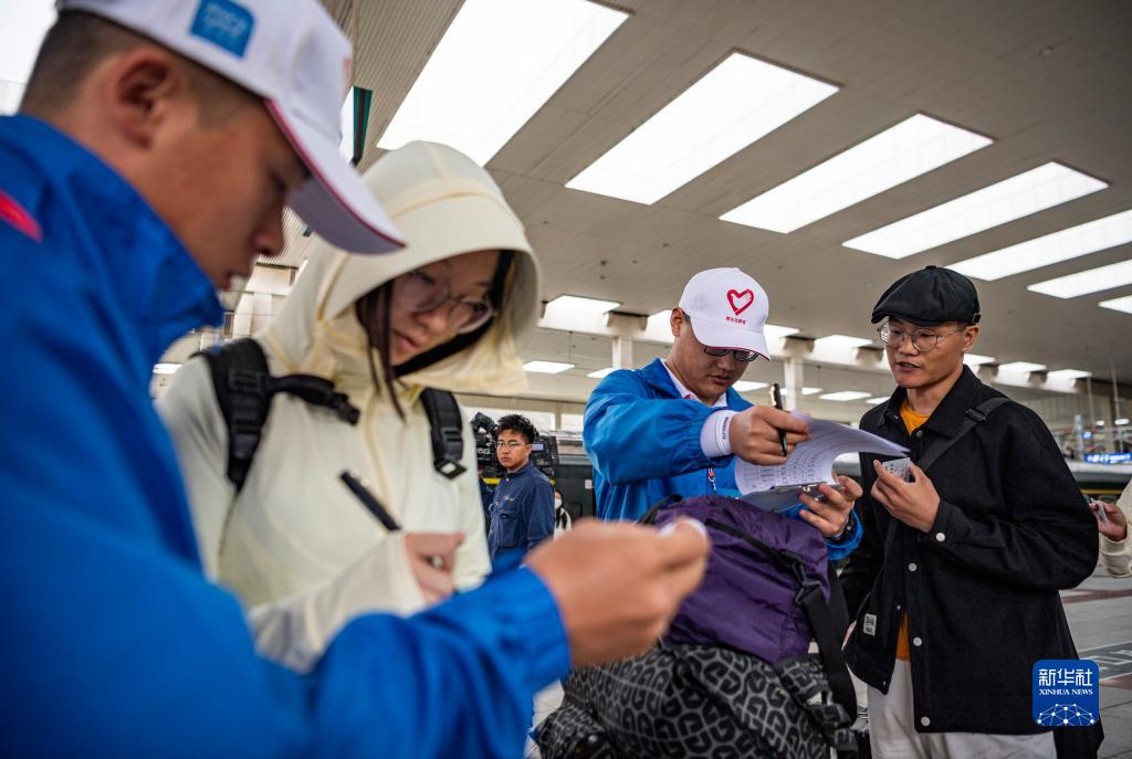7月24日,在拉薩火車站,工作人員為(wei) 抵達拉薩的誌願者登記信息。新華社記者 孫非 攝