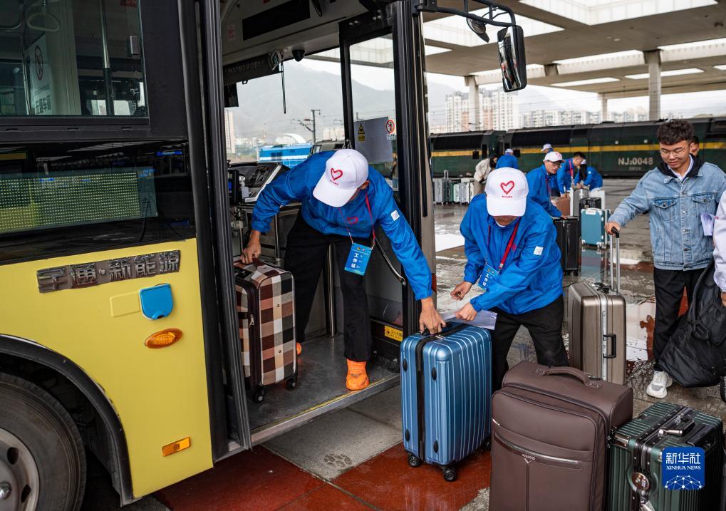 7月24日,在拉薩火車站,工作人員幫剛剛抵達拉薩的誌願者搬運行李。新華社記者 孫非 攝