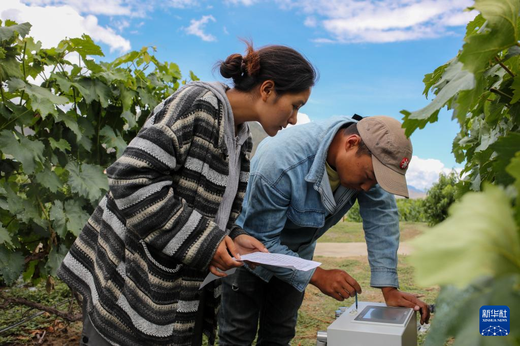 7月26日,桑日縣一家葡萄酒企業(ye) 的員工曲珍(左)在葡萄園裏向技術員何誌榮學習(xi) 操作光譜儀(yi) 。新華社記者 薑帆 攝