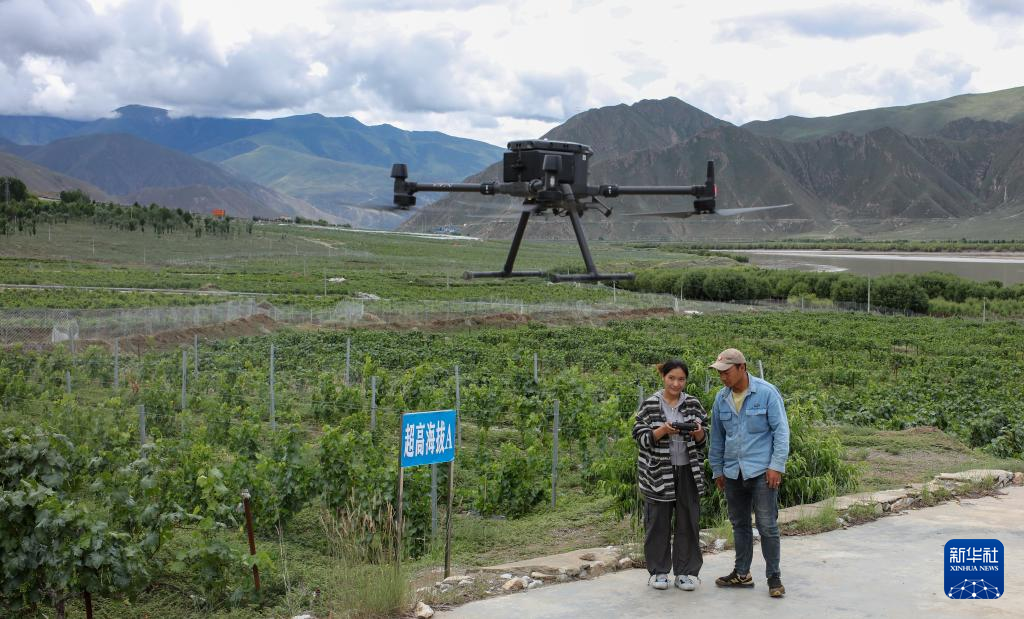 7月26日,桑日縣一家葡萄酒企業(ye) 的員工曲珍(左)在葡萄園裏向技術員何誌榮學習(xi) 使用農(nong) 用無人機。新華社記者 薑帆 攝