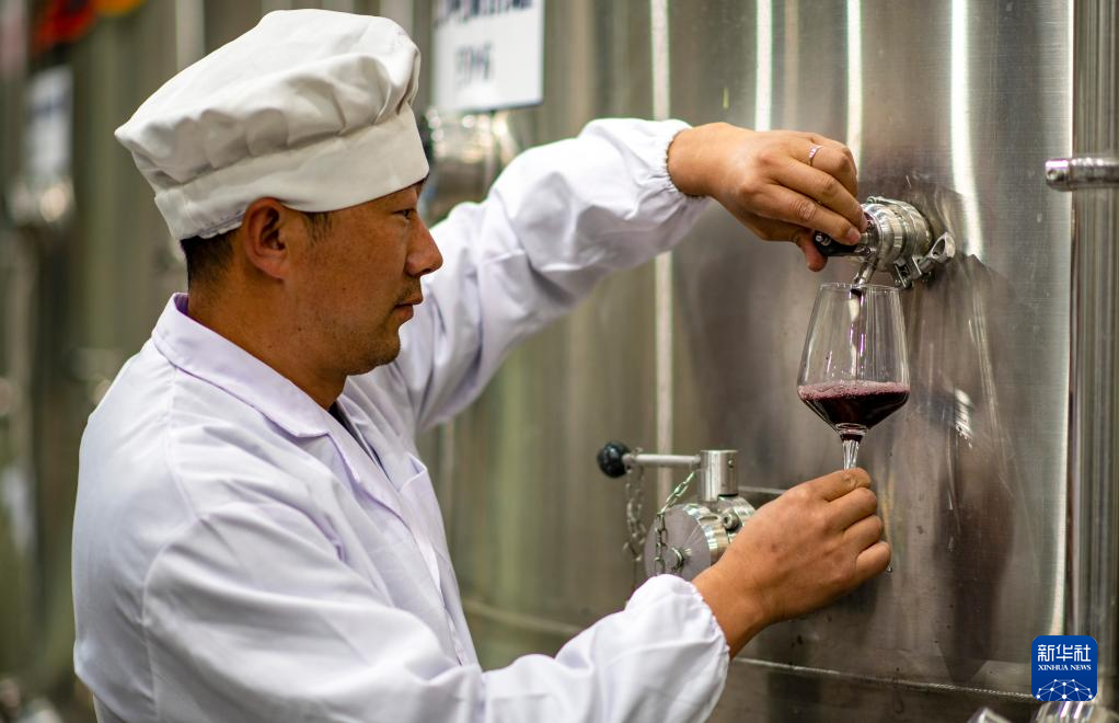 7月26日,桑日縣一家葡萄酒企業(ye) 的釀酒師李曉平在發酵車間檢查酒樣。新華社記者 旦增尼瑪曲珠 攝