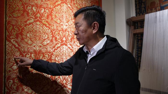 次旦還向記者展示了掛在門店樓梯口的一條掛毯,他稱,這是絲(si) 綢之路特別關(guan) 鍵的一個(ge) 圖案,明朝就有了。