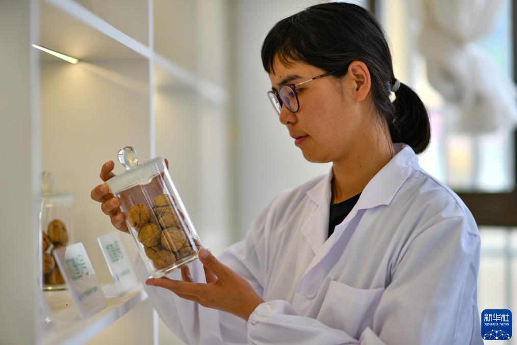 劉利平博士在高原核桃研究所檢查核桃果實標本(7月27日攝)。新華社記者 旦增尼瑪曲珠 攝