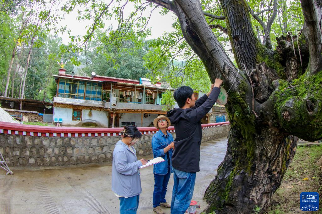 劉利平博士(中)在加查縣安繞鎮熱果村指導學生給一株古核桃樹掛牌(7月27日攝)。新華社記者 薑帆 攝
