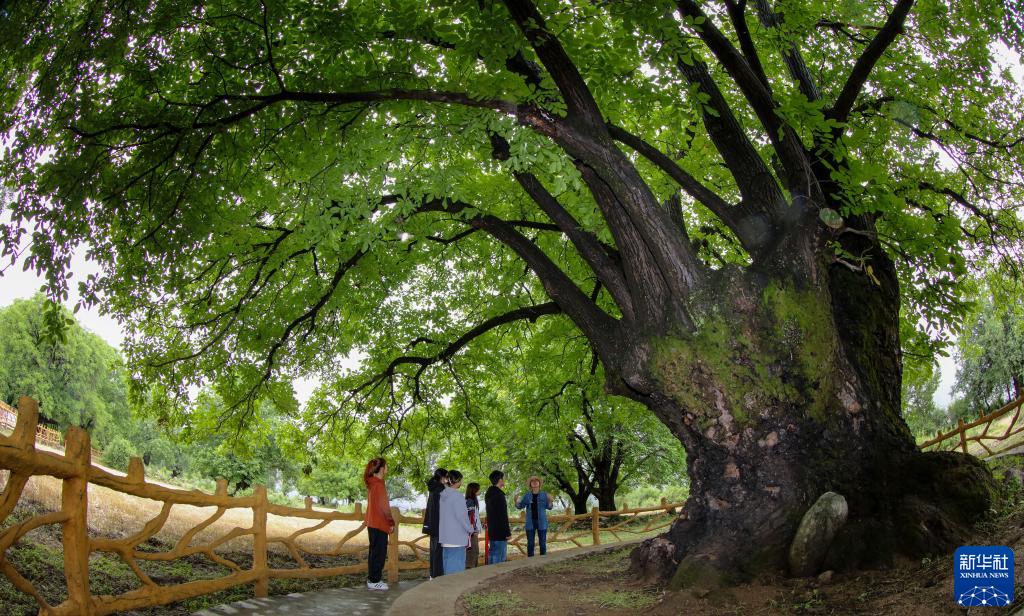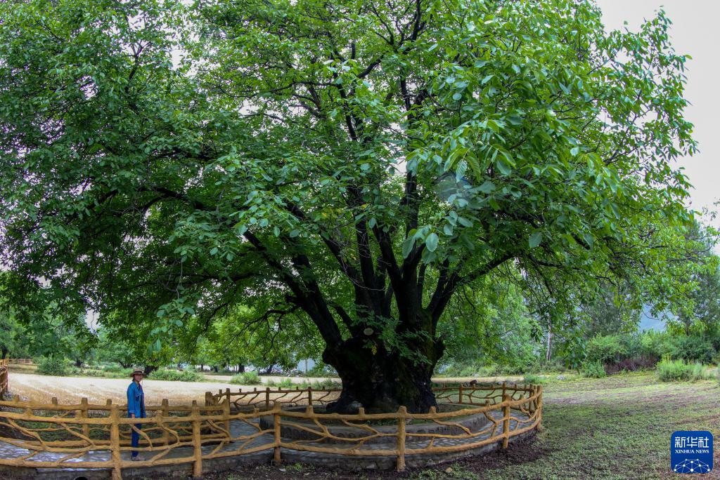 劉利平博士在加查縣安繞鎮熱果村查看一株樹齡1800餘(yu) 年的古核桃樹(7月27日攝)。新華社記者 旦增尼瑪曲珠 攝