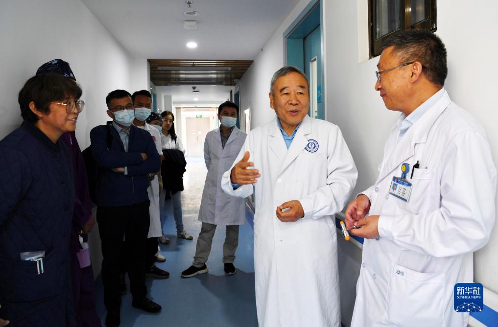 8月10日,中國科學院院士、首都醫科大學附屬北京天壇醫院神經外科學中心主任醫師趙繼宗(右二)和西藏第二人民醫院的醫生在醫院病房走廊裏交流。新華社記者 張汝鋒 攝