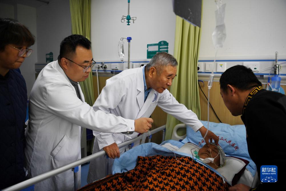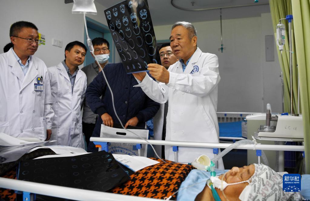 8月10日,中國科學院院士、首都醫科大學附屬北京天壇醫院神經外科學中心主任醫師趙繼宗(左三)和北京天壇醫院神經外科學中心主任醫師仇漢誠(左二)進行教學查房。新華社記者 張汝鋒 攝