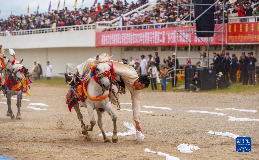 8月10日,騎手表演跑馬拾哈達。新華社記者 劉文博 攝