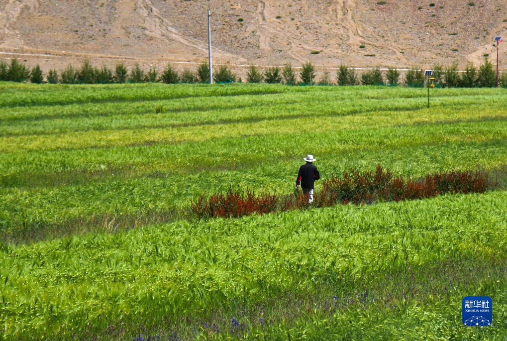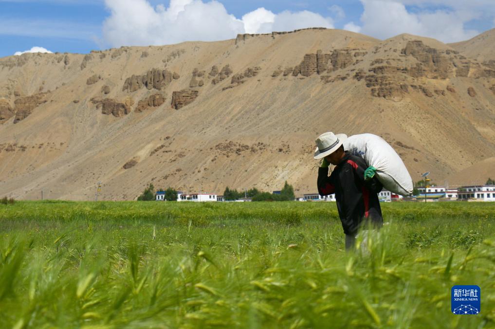 8月12日,西藏阿裏地區普蘭(lan) 縣赤德村村民在一片青稞田裏行走。新華社記者 聶毅 攝