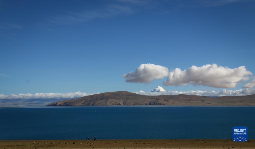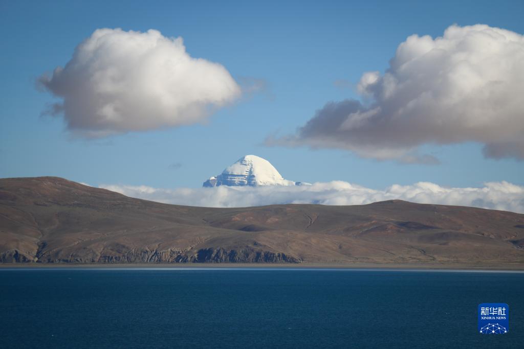 岡(gang) 仁波齊峰和湖水交相輝映(8月13日攝)。新華社記者 曹檳 攝