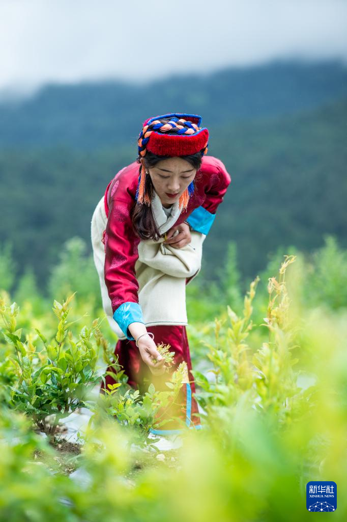 尼瑪卓瑪在田間采摘莓茶(7月29日攝)。新華社記者 旦增尼瑪曲珠 攝