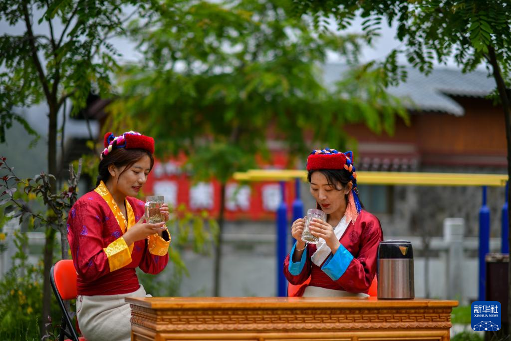 尼瑪卓瑪(右)與(yu) 村民一起品嚐新製成的莓茶(7月28日攝)。新華社記者 薑帆 攝