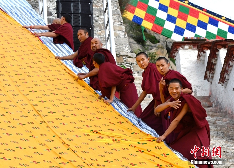 8月16日,巨幅強巴佛唐卡徐徐展開。