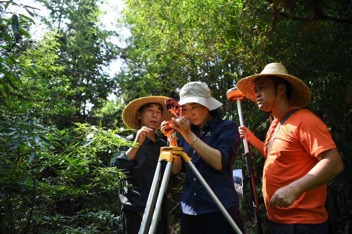 2022年9月22日,在廣東(dong) 韶關(guan) 樂(le) 昌市張溪村的生態監測樣地,白拉曲珍(中)和師傅江建發(左)、同事伍國清(右)在操作設備。新華社記者鄧華 攝