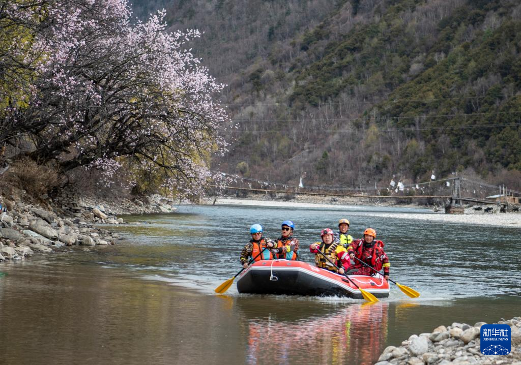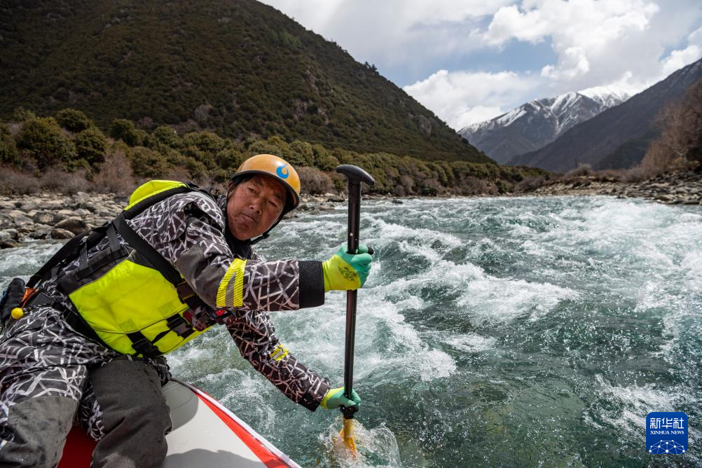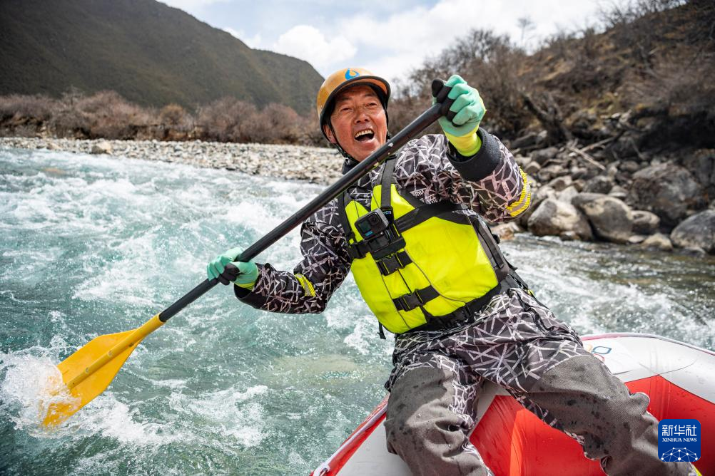 紮史品初正在巴河上漂流(4月14日攝)。新華社記者 孫非 攝