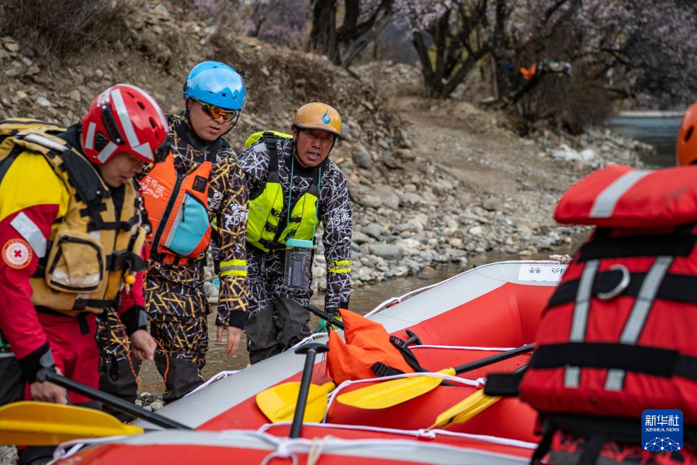 紮史品初(右二)和隊友在巴河上漂流(4月13日攝)。新華社記者 孫非 攝