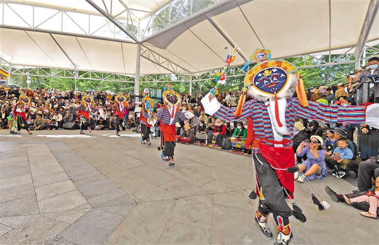 16日上午,在拉薩市宗角祿康公園,演員為(wei) 觀眾(zhong) 表演藏戲。記者 唐斌 王敏 攝