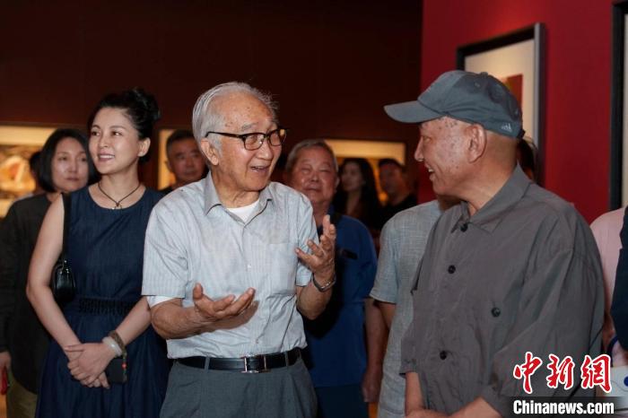 “藏色——巴瑪紮西畫展”亮相中國美術館,圖為(wei) 中國美術家協會(hui) 名譽主席、著名畫家靳尚誼(前排左一)與(yu) 藏族畫家巴瑪紮西(右一)交流。 伴藏文化供圖