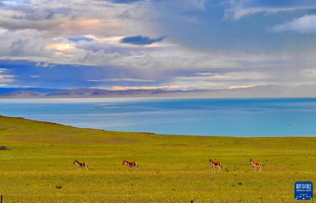 紮日南木錯湖畔的藏野驢(8月19日攝)。新華社記者 張汝鋒 攝