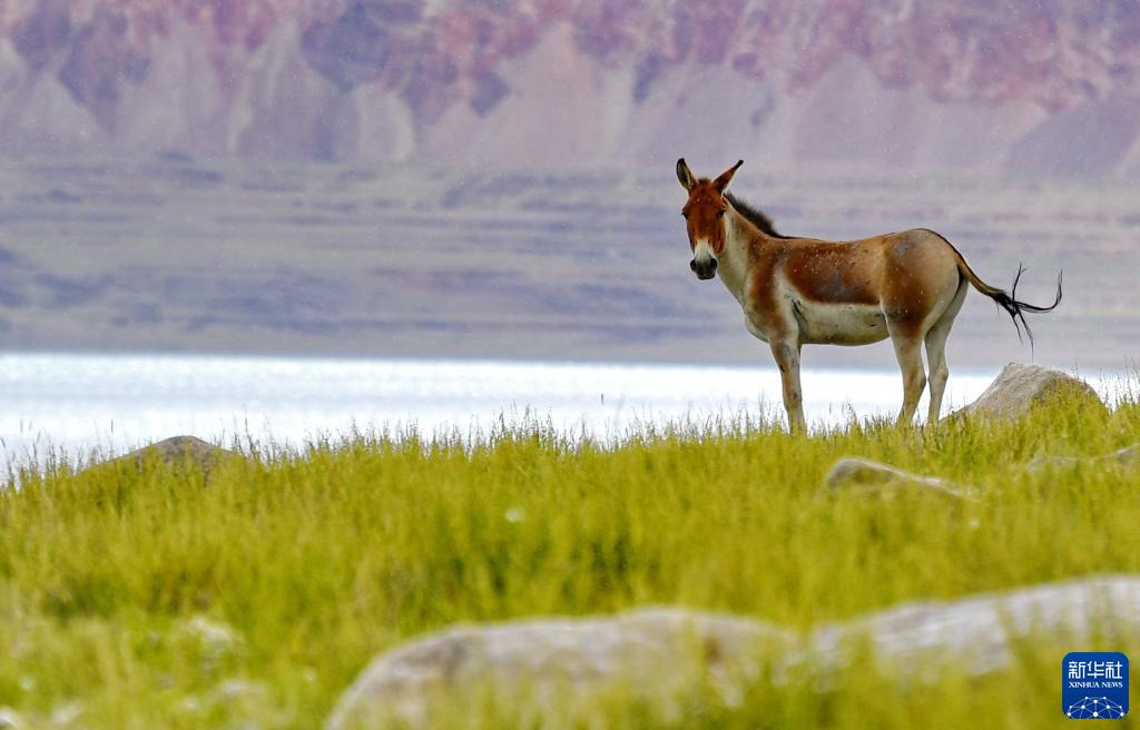 紮日南木錯湖畔的一頭藏野驢(8月19日攝)。新華社記者 張汝鋒 攝