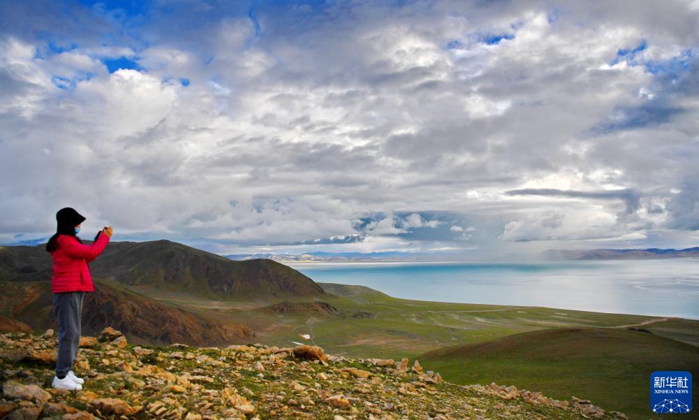 遊客在紮日南木錯湖畔拍攝(8月19日攝)。新華社記者 張汝鋒 攝