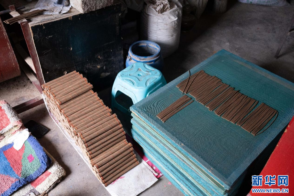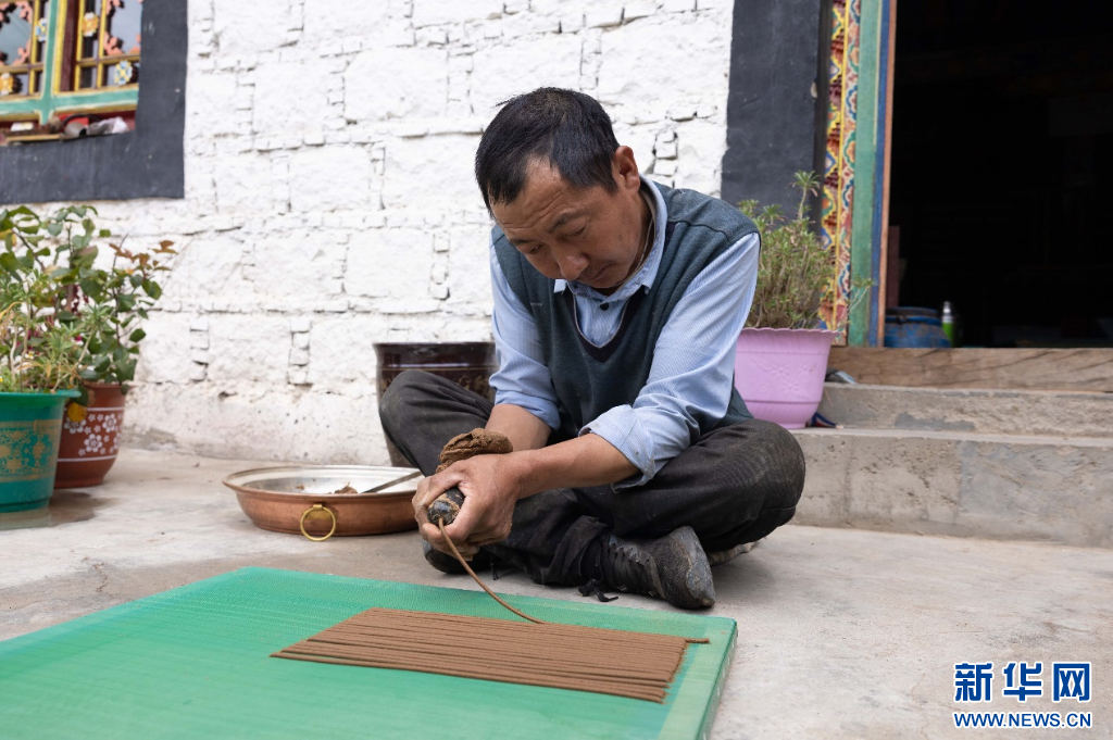 工作時,格桑次仁會(hui) 盤腿坐於(yu) 門前,熟練地揉搓著盆中的香泥,待其成型後再迅速放入帶孔的牛角中,用靈巧的手指擠出一道道筆直的線條,一根根均勻的藏香便呈現在人們(men) 的眼前。經過晾曬成型之後,這些藏香將會(hui) 被送至附近的大小寺廟,或是通過電商渠道發往全國各地。