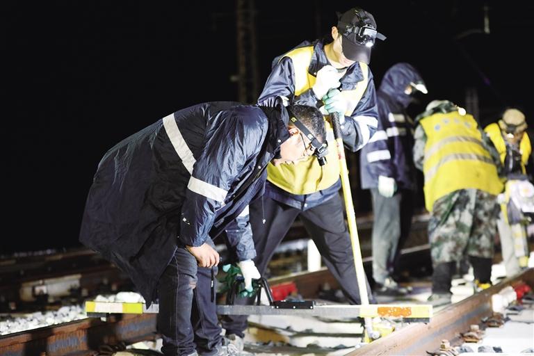 21時30分,作業(ye) 中,暴雨傾(qing) 盆而下,瞬間覆蓋了整個(ge) 施工現場,劈裏啪啦地打在現場作業(ye) 人員身上。早已經曆過無數次風雨洗禮的他們(men) ,握緊手中的工具,按照分工忙碌起來,有的測量數據、有的配合作業(ye) 、有的檢查設備、有的盯控安全……整個(ge) 作業(ye) 現場忙而有序,這場突降的暴風雨,儼(yan) 然已成為(wei) 促使他們(men) 奮進的鼓點,他們(men) 正用昂揚的鬥誌,奏響高原鐵路人的“天路夜曲”。