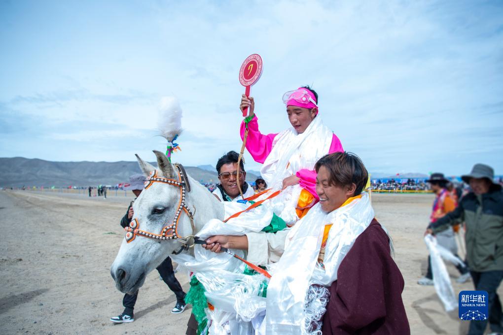 8月23日,改則縣巴桑倫(lun) 珠(上)和駿馬“玉赤達歐”在奪得8.5公裏速度賽冠軍(jun) 後。新華社發(旦增努布攝)