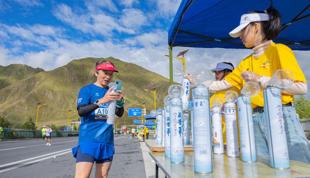 馬拉鬆愛好者正在領取氧氣罐。新華社發(丁增尼達 攝)